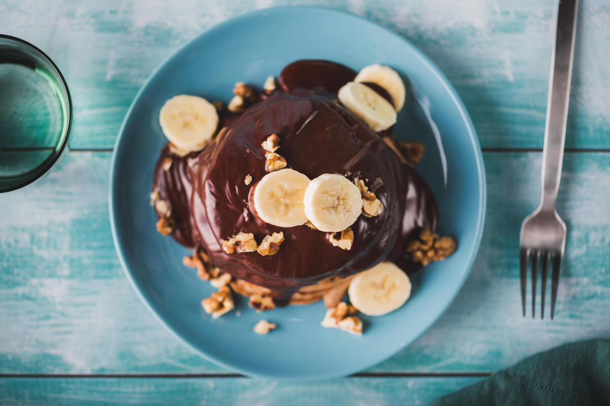 Cevizli ve muzlu pankek tarifimiz eşsiz bir lezzete sahip! Cevizin zengin tadı, tazecik muzların kokusu ve vanilya ile balın mükemmel uyumunu çikolata sosu ile taçlandırıyoruz.